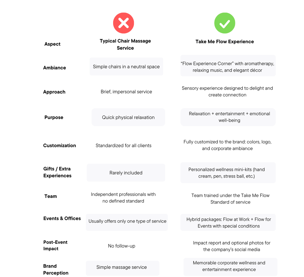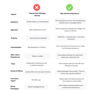 Take Me Flow provides non-therapeutic chair massage services intended exclusively for relaxation and workplace wellness.