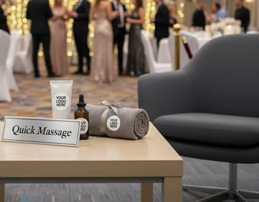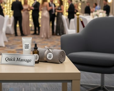 Options include custom pens, hand creams, mini essential oils, stress balls, or branded relaxation kits — perfect for adding a special touch to your event and reinforcing your brand.